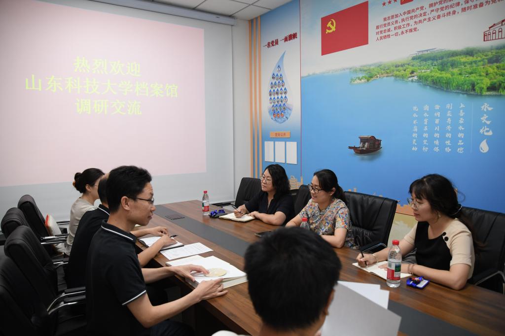 9月15日下午,在河海大学档案馆,馆长孙谦接待了调研组一行,利用服务部主任王玲介绍并展示了综合档案管理系统的使用情况,信息技术部主任胡以高分享了电子档案的存储与备份、异地异介质备份工作。靳文娟介绍了山东科技大学电子档案存储与备份现状、档案安全管理体系建设等。双方围绕综合档案管理系统与0A办公系统、教务、科研等业务系统的对接进行了交流。