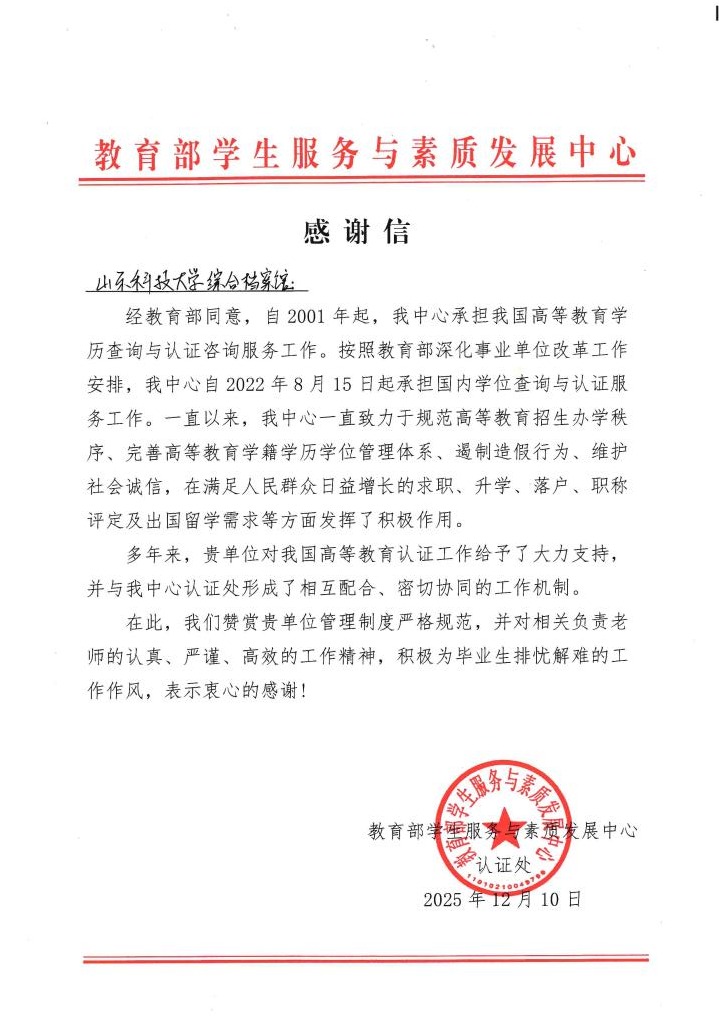 12月10日,教育部学生服务与素质发展中心(以下简称“中心”)发来感谢信,对学校档案馆在我国高等教育学历查询与认证咨询服务工作中给予的大力支持表示高度认可与感谢。该项工作已连续5年受到教育部表扬。