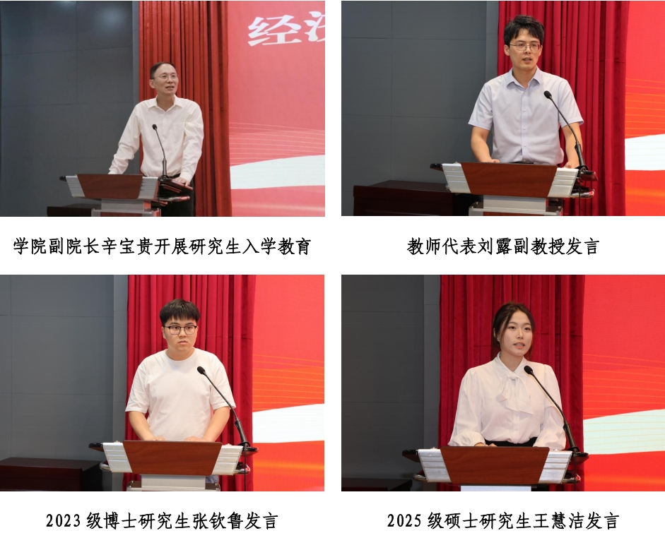 教师代表刘露以“三盏灯”为喻与同学们共勉,希望同学们明方向之灯,指引学术与职业道路,在多元选择中认清目标、找准定位;燃求知之灯,珍惜宝贵时光,夯实专业基础,持续锤炼科研能力与创新思维;点协作之灯,以开放包容的心态加强沟通与合作,积极拓展人脉资源,提升自身格局,在未来的学习与职业生涯中行稳致远。在校生代表、2023级博士研究生张钦鲁分享了个人学习心得和生活经验,鼓励新生们要厚植家国情怀、勇担历史使命,破解时代发展问题难题;要明确目标方向,做好本职工作,锤炼科学研究本领;要加强体育锻炼,提高心理素质,塑造坚强意志品质。新生代表、2025级管理科学与工程专业研究生王慧洁号召同学们要深耕学术,勇于探索未知,以敬畏之心对待专业,以更高标准要求自我;要践行校风,笃行求真务实,发扬“惟真求新”校训精神,扎根学术土壤;要直面挑战,筑牢基础,对接前沿,勤恳请教,寻求创新突破。